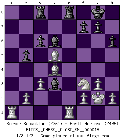 Last move : 1/2-1/2 2013 May 24 21:22:41 [Event "FICGS__CHESS__CLASS_SM__000018"] [Site "FICGS"] [Date "2012.12.05"] [Round "1"] [White "Boehme,Sebastian"] [Black "Hartl,Hermann"] [Result "1/2-1/2"] [WhiteElo "2361"] [BlackElo "2496"] 1.e4 e5 2.Nf3 Nc6 3.Bb5 a6 4.Ba4 Nf6 5.O-O Be7 6.Re1 b5 7.Bb3 O-O 8.c3 d5 9.exd5 Nxd5 10.Nxe5 Nxe5 11.Rxe5 c6 12.d3 Bd6 13.Re1 Bf5 14.Qf3 Qh4 15.g3 Qh3 16.Be3 Bxd3 17.Nd2 Qf5 18.Bd4 Rfe8 19.a4 h6 20.Kg2 Qxf3+ 21.Nxf3 Rac8 22.axb5 axb5 23.Bxd5 1/2-1/2 Ruy Lopez : Closed, 7...O-O Kingside Castling by player White (move 5) Kingside Castling by player Black (move 7) This chess game ended in a draw. Follow this game move after move (download)In Chess, at least, the brave inherit the earth. (Edmar Mednis) Im Hotelzimmer gab es nur zwei Schaben. (Über die Turnierbedingungen) (Peter Swidler) Un buen jugador siempre tiene buena suerte. (José Raúl Capablanca) Les sacrifices démontrent seulement que quelqu'un a gaffé. (Savielly Tartacover) You can't play chess if you're groggy from pills. (Anatoly Karpov)