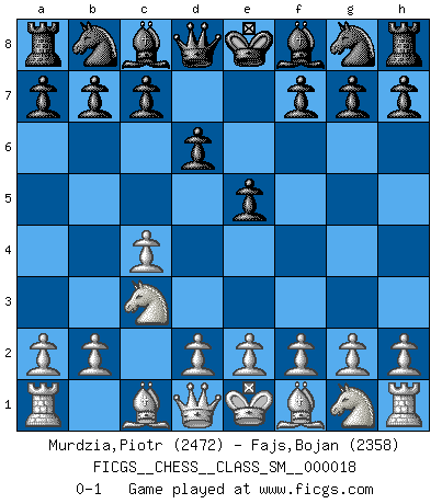 Last move : 0-1 2013 February 12 2:43:42 [Event "FICGS__CHESS__CLASS_SM__000018"] [Site "FICGS"] [Date "2012.12.05"] [Round "1"] [White "Murdzia,Piotr"] [Black "Fajs,Bojan"] [Result "0-1"] [WhiteElo "2472"] [BlackElo "2358"] 1.c4 e5 2.Nc3 d6 0-1 This chess game has been lost on time (started : 2012.12.05 22:1:3) English Opening Player Black won this chess game. Follow this game move after move (download)Openings teach you openings. Endgames teach you chess ! (Stephan Gerzadowicz) Der zweitbeste Zug ist oft der einzig richtige. (Savielly Grigorievitsch Tartakower) Una compensación adecuada por un sacrificio es tener una combinación sólida que conduce a una posición ganadora; una compensación adecuada por una metida de pata es dejar a tu oponente arrebatar una derrota de las fauces de la victoria. (Bruce A. Moon) La victoire dans une partie d'Echecs appartient la plupart du temps à celui qui voit un peu plus loin que l'adversaire. (Lasker) There are two kinds of people in the world, my friend. Those who have a loaded gun and those who dig. You dig ! (Blondie in The Good, The Bad and The Ugly)