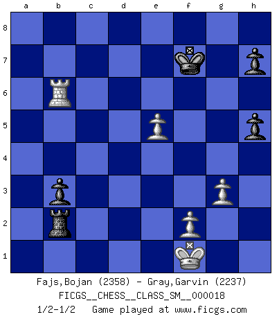 Last move : 1/2-1/2 2013 November 10 8:6:44 [Event "FICGS__CHESS__CLASS_SM__000018"] [Site "FICGS"] [Date "2012.12.05"] [Round "1"] [White "Fajs,Bojan"] [Black "Gray,Garvin"] [Result "1/2-1/2"] [WhiteElo "2358"] [BlackElo "2237"] 1.e4 e5 2.Nf3 Nc6 3.Bb5 a6 4.Ba4 Nf6 5.O-O Be7 6.Re1 b5 7.Bb3 O-O 8.c3 d6 9.d4 Bg4 10.Be3 exd4 11.cxd4 d5 12.e5 Ne4 13.Nc3 Nxc3 14.bxc3 Na5 15.Bc2 Nc4 16.Qd3 g6 17.Bh6 Re8 18.Qe2 Qd7 19.h3 Bf5 20.Nh2 a5 21.Bxf5 Qxf5 22.Ng4 Reb8 23.Rad1 b4 24.e6 Re8 25.exf7+ Qxf7 26.cxb4 axb4 27.Rc1 Kh8 28.Ne5 Nxe5 29.Qxe5+ Bf6 30.Qf4 Rxe1+ 31.Rxe1 Kg8 32.Rc1 Ra7 33.Rc2 Bg7 34.Qd2 Bxh6 35.Qxh6 Qe7 36.Qc1 Qd6 37.g3 Rb7 38.Re2 Kg7 39.Re8 c6 40.Qe3 Kf7 41.Rc8 Kg7 42.Qe8 Rd7 43.Kf1 Kh6 44.Qe3+ Kg7 45.h4 Qe7 46.Qf4 Rd6 47.Qe5+ Qxe5 48.dxe5 Rd7 49.Rxc6 Ra7 50.Rd6 Rxa2 51.Rxd5 Kf7 52.Rb5 Rb2 53.h5 gxh5 54.Rb6 b3 1/2-1/2 Ruy Lopez : Closed, 7...O-O Kingside Castling by player White (move 5) Kingside Castling by player Black (move 7) 10 pieces endgame at move 53 : White KRPPP , Black KRPPP WHITE : King + 1 Rook 3 Pawns BLACK : King + 1 Rook 3 Pawns This chess game ended in a draw. Follow this game move after move (download)Chess is a more highly symbolic game, but the aggressions are therefore even more frankly represented in the play. It probably began as a war game; that is, the representation of a miniature battle between the forces of two kingdoms. (Karl Meninger) Bis zum Jahr 1971 verlief in meiner Schachkariere alles glatt. Dieses dramatische Match [Fischer-Taimanov 6:0] machte mein Leben zur Hölle. (Mark Taimanov) No solamente yo pronostico su triunfo sobre Botvinnik, sino que me adelanto y digo que probablemente Fischer es el jugador de Ajedrez mas grande que haya existido. (John Collins) On croit qu'il y a plus de mauvais joueurs que de bons joueurs, c'est faux : Il y a autant de joueurs qui gagnent que de joueurs qui perdent. (Philippe Geluck) There is no instance of a country having benefited from prolonged warfare. (Sun Tzu)