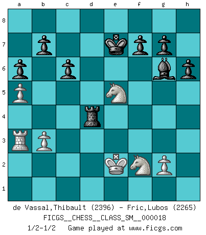 Last move : 1/2-1/2 2013 October 21 12:29:41 [Event "FICGS__CHESS__CLASS_SM__000018"] [Site "FICGS"] [Date "2012.12.05"] [Round "1"] [White "de Vassal,Thibault"] [Black "Fric,Lubos"] [Result "1/2-1/2"] [WhiteElo "2396"] [BlackElo "2265"] 1.d4 d5 2.c4 c6 3.Nc3 Nf6 4.e3 e6 5.Nf3 Nbd7 6.Qc2 Bd6 7.Bd3 O-O 8.O-O dxc4 9.Bxc4 Qe7 10.a4 h6 11.Rd1 Rd8 12.a5 e5 13.Be2 a6 14.b3 exd4 15.Nxd4 Ne5 16.Bb2 Neg4 17.h3 Nxe3 18.fxe3 Qxe3+ 19.Kf1 Bxh3 20.Qd3 Ng4 21.Bxg4 Qxd3+ 22.Rxd3 Bxg4 23.Ne4 Be5 24.Nf2 Bh5 25.Ra2 Bd6 26.Nf5 Bf8 27.Rxd8 Rxd8 28.Ba3 Bxa3 29.Rxa3 Kf8 30.Ne3 Rd4 31.Nc4 Bg6 32.Ke2 Ke7 33.Ne5 1/2-1/2 QGD Slav defense Kingside Castling by player Black (move 7) Kingside Castling by player White (move 8) This chess game ended in a draw. Follow this game move after move (download)I prefer to lose a really good game than to win a bad one. (David Levy) Schach ist ein schwarz-weisser Dschungel. (Garry Kasparov) Tu cuerpo tiene que estar en óptima condición. Tu Ajedrez se deteriora como lo hace tu cuerpo. No puedes separar la mente y el cuerpo. (Bobby Fischer) Les ravages du H expliquent la différence de niveau entre Tal et Thal [Abergel]. The only thing that matters is the evidence. (Horatio Caine, C.S.I. Miami)