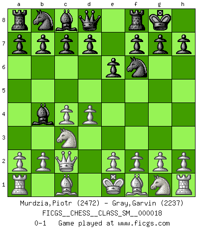 Last move : 0-1 2013 January 22 12:41:31 [Event "FICGS__CHESS__CLASS_SM__000018"] [Site "FICGS"] [Date "2012.12.05"] [Round "1"] [White "Murdzia,Piotr"] [Black "Gray,Garvin"] [Result "0-1"] [WhiteElo "2472"] [BlackElo "2237"] 1.c4 Nf6 2.Nc3 e6 3.d4 Bb4 4.Qc2 O-O 0-1 This chess game has been lost on time (started : 2012.12.05 22:1:3) English Opening Kingside Castling by player Black (move 4) Player Black won this chess game. Follow this game move after move (download)If your opponent cannot do anything active, then don't rush the position; instead you should let him sit there, suffer, and beg you for a draw. (Jeremy Silman) Ich war zu klein für die Schach-Schülermannschaft! (Woody Allen) Debemos de asegurarnos de que el Ajedrez no se convierta en un lenguaje muerto, muy interesante, pero solo para un grupo muy pequeño. (Sytze Faber) Pour se monter efficace, un Cavalier a besoin d'avant-postes ! Les Cavaliers font les meilleurs bloqueurs de pions passés. The project of the man are lower than those of the sky. (Chinese proverb)