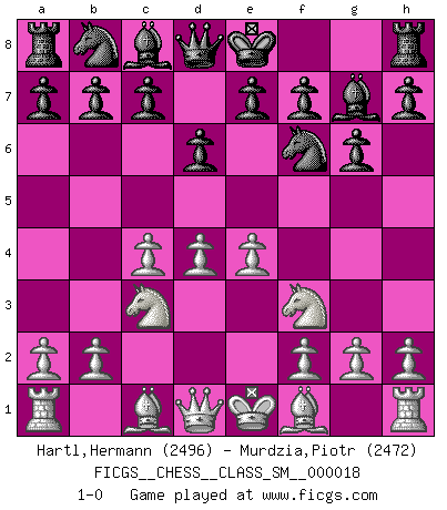 Last move : 1-0 2013 January 27 0:58:11 [Event "FICGS__CHESS__CLASS_SM__000018"] [Site "FICGS"] [Date "2012.12.05"] [Round "1"] [White "Hartl,Hermann"] [Black "Murdzia,Piotr"] [Result "1-0"] [WhiteElo "2496"] [BlackElo "2472"] 1.d4 Nf6 2.c4 g6 3.Nc3 Bg7 4.e4 d6 5.Nf3 1-0 This chess game has been lost on time (started : 2012.12.05 22:1:3) King's Indian : 5.Nf3 Player White won this chess game. Follow this game move after move (download)Chess is imagination. (David Bronstein) Ohne Fehler kann es keine Brillanz geben. (Emanuel Lasker) Uno por uno, yo los acribillé, mi superioridad muy pronto se volvio aparente. (Jose Capablanca) Les réformistes prétendent que les progrès de la théorie conduiront à la disparition des échecs, et qu'il faut, pour leur rendre vie, en remanier les règles. En réalité, qu'exprime cette affirmation? Le mépris de l'intuition, de l'imagination et de tous les autres éléments qui font des échecs un art. (Alexander Alekhine) Are you threatening me, Master Jedi ? (Chancellor Palpatine in Star Wars ep.3)