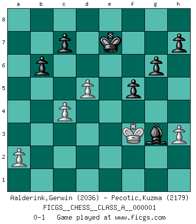 Last move : 0-1 2006 October 11 12:1:1 [Event "FICGS__CHESS__CLASS_A__000001"] [Site "FICGS"] [Date "2006.04.08"] [Round "1"] [White "Aalderink,Gerwin"] [Black "Pecotic,Kuzma"] [Result "0-1"] [WhiteElo "2036"] [BlackElo "2179"] 1.e4 e5 2.Nf3 Nc6 3.c3 d5 4.Qa4 Bd7 5.exd5 Nd4 6.Qd1 Nxf3+ 7.Qxf3 Nf6 8.Bc4 e4 9.Qe2 Bd6 10.d3 O-O 11.dxe4 Nxe4 12.Be3 Re8 13.Nd2 Nxd2 14.Qxd2 Qh4 15.Be2 Rxe3 16.Qxe3 Re8 17.Qxa7 Bb5 18.O-O-O Qg5+ 19.Kb1 Bxe2 20.Rhe1 Kf8 21.g3 Bxd1 22.Rxd1 Qf5+ 23.Kc1 Re2 24.Rd2 Re1+ 25.Rd1 Rxd1+ 26.Kxd1 Qb1+ 27.Kd2 Qxb2+ 28.Kd3 b6 29.Qa8+ Ke7 30.Qa4 Qxf2 31.Qh4+ Ke8 32.Qe4+ Kf8 33.Qe2 Qf5+ 34.Qe4 Qxe4+ 35.Kxe4 Ke7 36.c4 g6 37.Kf3 f5 38.h3 Bxg3 0-1 This chess game has been lost on time (started : 2006.04.08 16:54:26) Ponziani : Caro variation Kingside Castling by player Black (move 10) Queenside Castling by player White (move 18) Player Black won this chess game. Follow this game move after move (download)If your opponent cannot do anything active, then don't rush the position; instead you should let him sit there, suffer, and beg you for a draw. (Jeremy Silman) Mein Gehirn das ist mein zweitwichtigstes Organ [Aus dem Film: Der Schläfer]. (Woody Allen) Si tu oponente no puede hacer nada activo, entonces no apures la posición; En vez de eso, dejalo estar sentado ahí, sufriendo y rogandote por un empate. (Jeremy Silman) Toutes les manuvres exécutées sur une colonne ouverte ont pour but ultime l'intrusion définitive sur la septième ou la huitième rangée, en plein cur de la position ennemie. (Aaron Nimzovitch) How many people work in NATO Headquarters ? - About half of them. (Dirk Stikker, NATO general secretary)