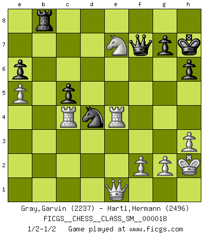 Last move : 1/2-1/2 2013 February 11 21:28:36 [Event "FICGS__CHESS__CLASS_SM__000018"] [Site "FICGS"] [Date "2012.12.05"] [Round "1"] [White "Gray,Garvin"] [Black "Hartl,Hermann"] [Result "1/2-1/2"] [WhiteElo "2237"] [BlackElo "2496"] 1.e4 e5 2.Nf3 Nc6 3.Bb5 a6 4.Ba4 Nf6 5.O-O Be7 6.Re1 b5 7.Bb3 O-O 8.d3 d6 9.a4 b4 10.Nbd2 h6 11.h3 Be6 12.Bxe6 fxe6 13.c3 Rb8 14.d4 bxc3 15.bxc3 exd4 16.cxd4 d5 17.Ba3 Bxa3 18.Rxa3 Nxe4 19.Nxe4 dxe4 20.Rxe4 Qd5 21.Qe1 Rb4 22.a5 Rfb8 23.Ra1 e5 24.Nxe5 Nxd4 25.Ng6 Qf7 26.Ne7+ Kh7 27.Rc1 c5 28.Kh2 Rc4 29.Rxc4 1/2-1/2 Ruy Lopez : Closed, 7...O-O Kingside Castling by player White (move 5) Kingside Castling by player Black (move 7) This chess game ended in a draw. Follow this game move after move (download)The winner of the game is the player who makes the next-to-last mistake. (Savielly Tartakover) Es gibt keine einzige Frau, der ich nicht einen Springer vorgeben könnte und trotzdem gewänne. (Robert James Fischer) Un sacrificio se refuta mucho mejor al aceptarlo. (Wilhelm Steinitz) Celui qui prend des risques peut perdre, celui qui n'en prend pas perd toujours. (Xavier Tartacover) If you are going through hell, keep going. (Winston Churchill)