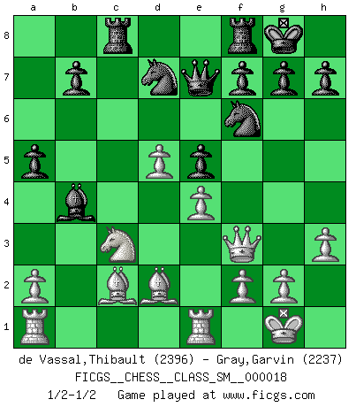 Last move : 1/2-1/2 2013 April 25 0:36:20 [Event "FICGS__CHESS__CLASS_SM__000018"] [Site "FICGS"] [Date "2012.12.05"] [Round "1"] [White "de Vassal,Thibault"] [Black "Gray,Garvin"] [Result "1/2-1/2"] [WhiteElo "2396"] [BlackElo "2237"] 1.d4 Nf6 2.Nf3 d5 3.c4 c6 4.Nc3 e6 5.e3 a6 6.b3 Bb4 7.Bd2 Nbd7 8.Bd3 O-O 9.O-O Qe7 10.Qe1 a5 11.e4 dxc4 12.bxc4 e5 13.d5 Nc5 14.Bc2 Bg4 15.Qe3 Ncd7 16.h3 Bxf3 17.Qxf3 cxd5 18.cxd5 Rac8 19.Rfc1 Ba3 20.Re1 Bb4 1/2-1/2 Queen's pawn game Kingside Castling by player Black (move 8) Kingside Castling by player White (move 9) This chess game ended in a draw. Follow this game move after move (download)Chess is the gymnasium of the mind. (Blaise Pascal) Obwohl ich vom Stil her kaum zu den Priestern der Schachkunst gezählt werde, halte ich Schach doch für eine Kunst. (Tigran Petrosjan) El poder defensivo de una pieza clavada, solamente es imaginario. (Aaron Nimzovich) L'ordinateur a tué l'originalité. Il n'y a plus guère d'aventures sur l'échiquier. (Jacob Murray) The right perception of any matter and a misunderstanding of the same matter do not wholly exclude each other. (Kafka's the trial)