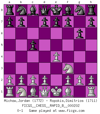 Last move : 0-1 2013 January 21 0:38:40 [Event "FICGS__CHESS__RAPID_B__000202"] [Site "FICGS"] [Date "2012.12.07"] [Round "1"] [White "Michow,Jordan"] [Black "Ropokis,Dimitrios"] [Result "0-1"] [WhiteElo "1772"] [BlackElo "1711"] 1.e4 c5 2.Nf3 g6 0-1 This chess game has been lost on time (started : 2012.12.07 3:42:23) Sicilian : Hungarian variation Player Black won this chess game. Follow this game move after move (download)Chess is like life. (Boris Spassky) Ja, ich habe einmal eine Blitzpartie gespielt, es war in einem Zug, 1929. --im Interview 1989 (Mikhail Moiseyevich Botvinik) La estratégia requiere pensar, la táctica requiere observación. (Max Euwe) Les échecs, c'est l'art d'analyser. (Mikhail Botvinnik) Work expands to fill the time available. (C. Northcote Parkinson, in Parkinson's Laws)