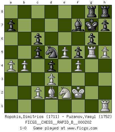 Last move : 1-0 2013 April 6 22:42:6 [Event "FICGS__CHESS__RAPID_B__000202"] [Site "FICGS"] [Date "2012.12.07"] [Round "1"] [White "Ropokis,Dimitrios"] [Black "Puzanov,Vasyl"] [Result "1-0"] [WhiteElo "1711"] [BlackElo "1752"] 1.e4 c5 2.Nc3 Nc6 3.f4 e6 4.Nf3 d5 5.Bb5 d4 6.Bxc6+ bxc6 7.Ne2 Nf6 8.d3 Be7 9.O-O Ba6 10.h3 O-O 11.g4 Nd7 12.b3 Qc7 13.Qe1 f5 14.gxf5 exf5 15.e5 Qd8 16.a4 Nb6 17.Qa5 Bc8 18.Kh2 Be6 19.Rg1 Nd5 20.Qxd8 Raxd8 21.Bd2 Bd7 22.Rg3 g6 23.h4 Kg7 24.h5 Rh8 25.Kg2 Be6 26.Rh1 Rdg8 27.Kf2 Bf7 28.Ng5 Bxg5 29.Rxg5 Rb8 30.Rhg1 Ne7 31.Rc1 Nd5 32.Rh1 Rbg8 33.b4 1-0 Sicilian : Grand Prix attack Kingside Castling by player White (move 9) Kingside Castling by player Black (move 10) Player White won this chess game. Follow this game move after move (download)By this measure (on the gap between Fischer & his contemporaries), I consider him the greatest world champion. (Garry Kasparov) Das Blackmar-Diemer-Gambit verändert den ganzen Menschen! (Emil Joseph Diemer) Yo considero que Fischer es uno de los expertos mas grandes de aperturas de siempre. (Keith Hayward) À la honte des hommes, on sait que les lois du jeu sont les seules qui soient partout justes, claires, inviolables et exécutées. Pourquoi l'Indien qui a donné les règles du jeu d'échecs est-il obéi de bon gré dans toute la terre, et que les décrétales des papes, par exemple, sont aujourd'hui un objet d'horreur et de mépris ? C'est que l'inventeur des échecs combina tout avec justesse pour la satisfaction des joueurs, et que les papes, dans leurs décrétales, n'eurent en vue que leur seul avantage. L'Indien voulut exercer également l'esprit des hommes et leur donner du plaisir; les papes ont voulu abrutir l'esprit des hommes. Voltaire (Dictionnaire philosophique / Garnier 1967) If we don't succeed, we run the risk of failure. (George W. Bush)