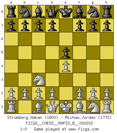 Last move : 1-0 2013 January 15 12:21:26 [Event "FICGS__CHESS__RAPID_B__000202"] [Site "FICGS"] [Date "2012.12.07"] [Round "1"] [White "Stromberg,Hakan"] [Black "Michow,Jordan"] [Result "1-0"] [WhiteElo "1800"] [BlackElo "1772"] 1.e4 e5 2.Nc3 1-0 This chess game has been lost on time (started : 2012.12.07 3:42:23) Vienna game Player White won this chess game. Follow this game move after move (download)Tactics flow from a superior position. (Bobby Fischer) Ich suche im Schach immer etwas Eigenes. Riskantes Spiel im Stile schachlicher Musketiere ist nicht meine Sache, auch wenn es vielen Freunden scharfer Wendungen gefällt. (Anatoly Karpov) Una mala movida nulifica cuarenta buenas. (Horowitz) Si rien de grave n'est détecté lors de l'analyse d'une position, on joue alors le coup. Seconde règle de Blumenfeld. Fear is the path to the dark side. Fear leads to anger; anger leads to hate; hate leads to suffering. I sense much fear in you. (Master Yoda in Star Wars ep.1)
