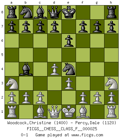Last move : 0-1 2007 March 3 18:24:57 [Event "FICGS__CHESS__CLASS_F__000025"] [Site "FICGS"] [Date "2007.01.19"] [Round "1"] [White "Woodcock,Christine"] [Black "Percy,Dale"] [Result "0-1"] [WhiteElo "1400"] [BlackElo "1120"] 1.d4 e6 2.e3 Nf6 3.Na3 Ne4 4.Nh3 Bb4+ 0-1 This chess game has been lost on time (started : 2007.01.19 18:49:8) Queen's pawn Player Black won this chess game. Follow this game move after move (download)Examine moves that smite! A good eye for smites is far more important than a knowledge of strategical principles. (Purdy) Es tut gut, die Entwicklungsperiode von, [...] demokratischem Geist durchdringen zu lassen. Wie undemokratisch wäre es doch beispielsweise, den einen Offizier große Spaziertouren vornehmen zu lassen, während die anderen zu Hause säßen und sich entsetzlich langweilten. (Aaron Nimzowitsch) El Ajedrez es un expediente tonto que hace creer a la gente inactiva que hacen una cosa muy astuta cuando solamente estan perdiendo su tiempo. (George Bernard Shaw) A chaque perte on perd un peu de soi. (Joël Lautier) Computers are like Old Testament gods; lots of rules and no mercy. (Joseph Campbell)