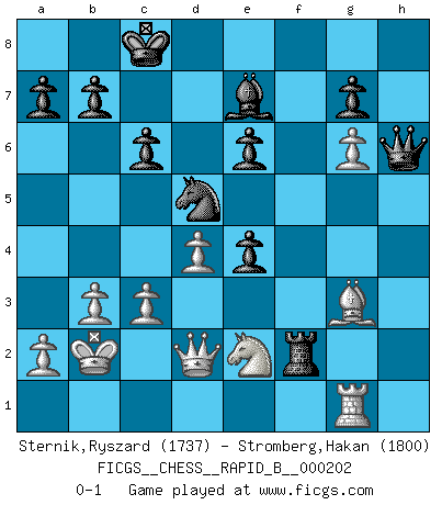 Last move : 0-1 2013 January 25 21:45:39 [Event "FICGS__CHESS__RAPID_B__000202"] [Site "FICGS"] [Date "2012.12.07"] [Round "1"] [White "Sternik,Ryszard"] [Black "Stromberg,Hakan"] [Result "0-1"] [WhiteElo "1737"] [BlackElo "1800"] 1.e4 c6 2.d4 d5 3.e5 Bf5 4.g4 Be4 5.f3 Bg6 6.h4 h5 7.e6 Qd6 8.exf7+ Bxf7 9.Be3 hxg4 10.fxg4 Nf6 11.g5 Ne4 12.Ne2 Bh5 13.Qc1 Nd7 14.Nd2 O-O-O 15.Nxe4 dxe4 16.Qd2 Bf3 17.Rh3 Nb6 18.Bf4 Qd5 19.b3 Qf5 20.Rh2 Nd5 21.Bh3 Bg4 22.Bxg4 Qxg4 23.O-O-O e6 24.Be5 Rxh4 25.Rxh4 Qxh4 26.Kb2 Bb4 27.c3 Be7 28.Rg1 Rf8 29.g6 Rf2 30.Bg3 Qh6 0-1 Caro-Kann : Advance variation Queenside Castling by player Black (move 14) Queenside Castling by player White (move 23) Player Black won this chess game. Follow this game move after move (download)The passed Pawn is a criminal, who should be kept under lock and key. Mild measures, such as police surveillance, are not sufficient. (Aaron Nimzovich) Wie kann ich Remis annehmen? Ich weiß ja gar nicht, wie ich stehe! (Fritz Sämisch) El Ajedrez es el juego mas altamente simbólico, pero las agresiones estan por lo tanto aún mas francamente representadas en la partida. Tal vez comenzo como un juego de guerra; Algo como la representación de una batalla en miniatura entre las fuerzas de dos reinos. (Karl Meninger) Le jeu d'échecs est comme rejeté hors du temps. (Antoine de Saint-Exupéry) Whatever you do, don't be bored. This is absolutely the most exciting time we could have possibly hoped to be alive. And things are just starting. (From movie Waking life)