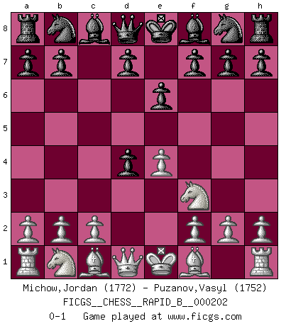 Last move : 0-1 2013 January 24 12:43:39 [Event "FICGS__CHESS__RAPID_B__000202"] [Site "FICGS"] [Date "2012.12.07"] [Round "1"] [White "Michow,Jordan"] [Black "Puzanov,Vasyl"] [Result "0-1"] [WhiteElo "1772"] [BlackElo "1752"] 1.e4 c5 2.Nf3 e6 3.d4 cxd4 0-1 This chess game has been lost on time (started : 2012.12.07 3:42:23) Sicilian defense Player Black won this chess game. Follow this game move after move (download)Life is like a game of Chess, changing with each move. (Chinese proverb) Computer sind die einzigen Gegner, die nicht immer eine Ausrede auf Lager haben, wenn sie gegen mich verlieren. (Robert James Fischer) Yo no le temo a Spassky. Todos saben que yo soy el mejor. Uno no necesita un torneo para probarlo. (Bobby Fischer) Echiquier : carré parfait, comme la Jérusalem nouvelle décrite par l'auteur de l'Apocalypse, huit cases sur huit, exaltation du chiffre 4, symbole du cosmos aux quatre horizons... où le noir et le blanc, l'ombre et la lumière, le mal et le bien s'entremêlent et se conjuguent. (Robert Couffignal, Le Gambit du poète) A good teacher is like a candle - it consumes itself to light the way for others. (Author unknown)