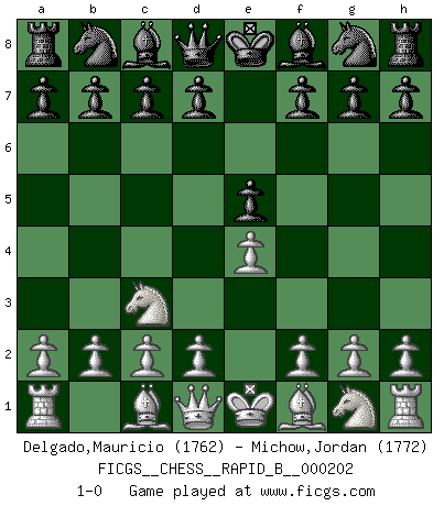 Last move : 1-0 2013 January 17 0:33:0 [Event "FICGS__CHESS__RAPID_B__000202"] [Site "FICGS"] [Date "2012.12.07"] [Round "1"] [White "Delgado,Mauricio"] [Black "Michow,Jordan"] [Result "1-0"] [WhiteElo "1762"] [BlackElo "1772"] 1.e4 e5 2.Nc3 1-0 This chess game has been lost on time (started : 2012.12.07 3:42:23) Vienna game Player White won this chess game. Follow this game move after move (download)I had a toothache during the first game. In the second game I had a headache. In the third game it was an attack of rheumatism. In the fourth game, I wasn't feeling well. And in the fifth game? Well, must one have to win every game ? (Siegbert Tarrasch) Eine Person mit durchschnittlichem IQ kann etwa eine ELO von 2000 erreichen. (Jonathan Levitt) Tu sabes que vas a perder. Aún cuando tenía la ventaja, yo sabía que iba a perder. - al estar jugando con Fischer (Andrew Soltis) Demandez au pauvre Cg1 ce qu'il en pense. Eduard Gufeld à propos de la variante Saemisch de l'Est-Indienne. A shortcut is the longest distance between two points. (Don Groves)