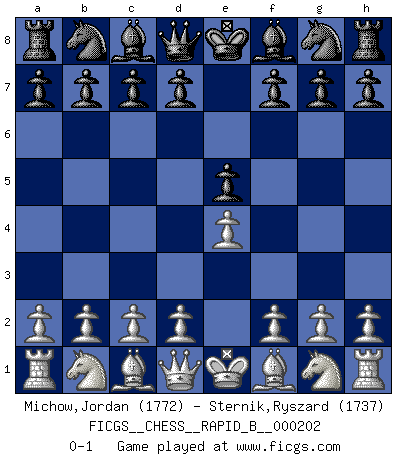Last move : 0-1 2013 January 15 0:19:0 [Event "FICGS__CHESS__RAPID_B__000202"] [Site "FICGS"] [Date "2012.12.07"] [Round "1"] [White "Michow,Jordan"] [Black "Sternik,Ryszard"] [Result "0-1"] [WhiteElo "1772"] [BlackElo "1737"] 1.e4 e5 0-1 This chess game has been lost on time (started : 2012.12.07 3:42:23) King's pawn game Player Black won this chess game. Follow this game move after move (download)Bobby Fischer's current state of mind is indeed a tragedy. One of the world's greatest Chess players - the pride and sorrow of American Chess. (Frank Brady) Je älter ich werde, um so mehr schätze ich die Bauern. (Paul Keres) Un buen jugador siempre tiene buena suerte. (José Raúl Capablanca) Les ravages du H expliquent la différence de niveau entre Tal et Thal [Abergel]. Tomorrow's what you make of it. (Horatio Caine, C.S.I. Miami)