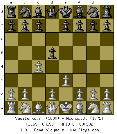 Last move : 1-0 2013 January 15 0:19:0 [Event "FICGS__CHESS__RAPID_B__000202"] [Site "FICGS"] [Date "2012.12.07"] [Round "1"] [White "Vasilenko,Yaroslav"] [Black "Michow,Jordan"] [Result "1-0"] [WhiteElo "1800"] [BlackElo "1772"] 1.c4 d5 2.e3 1-0 This chess game has been lost on time (started : 2012.12.07 3:42:23) English Opening Player White won this chess game. Follow this game move after move (download)A good sacrifice is one that is not necessarily sound but leaves your opponent dazed and confused. (Rudolph Spielmann) Frage des Reporters: -Worin besteht das Ziel von Gambiteröffnungen? Antwort: -Auf Kosten der Partie einen Ruf als Angriffspieler zu erwerben.- (Siegbert Tarrasch) Prefiero perder una partida realmente buena, que ganar una mala. (David Levy) La guerre est enfant de la passion, la passion est enfant du narcissisme et le narcissisme est l'enfant. (...) Une autre partie ? (Thibault de Vassal) Industry executives and analysts often mistakenly talk about strategy as if it were some kind of chess match. But in chess, you have just two opponents, each with identical resources, and with luck playing a minimal role. The real world is much more like a poker game, with multiple players trying to make the best of whatever hand fortune has dealt them. In our industry, Bill Gates owns the table until someone proves otherwise. (David Moschella, 'Computerworld')
