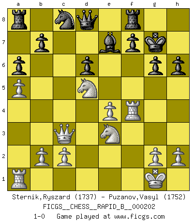 Last move : 1-0 2013 February 18 3:44:34 [Event "FICGS__CHESS__RAPID_B__000202"] [Site "FICGS"] [Date "2012.12.07"] [Round "1"] [White "Sternik,Ryszard"] [Black "Puzanov,Vasyl"] [Result "1-0"] [WhiteElo "1737"] [BlackElo "1752"] 1.e4 c5 2.Nf3 d6 3.d4 cxd4 4.Nxd4 Nf6 5.Nc3 e5 6.Bb5+ Bd7 7.Bxd7+ Nbxd7 8.Nf5 Nb6 9.Bg5 g6 10.Ne3 Be7 11.Qd3 h6 12.Bxf6 Bxf6 13.O-O O-O 14.a4 a6 15.a5 Nc8 16.Ncd5 Be7 17.f4 exf4 18.Rxf4 Kg7 19.Qc3+ 1-0 This chess game has been lost on time (started : 2012.12.07 3:42:23) Sicilian : Venice attack Kingside Castling by player White (move 13) Kingside Castling by player Black (move 13) Player White won this chess game. Follow this game move after move (download)Bobby Fischer is the greatest Chess genius of all time ! (Alexander Kotov) Schach ist die gewalttätigste aller Sportarten. (Garry Kasparov) El Ajedrez moderno está demasiado preocupado con cosas como la estructura de Peones. Olvidenlo, el Jaque Mate termina la partida. (Nigel Short) Le profane ne songe pas à la somme de jouissance dont il se prive, qui méconnaît ce jeu aux ressources aussi variées que passionnantes. (Jean-Marie Jeanton-Lamarche) Two beer, or not two beer. (Unknown)