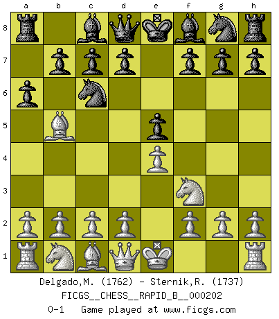 Last move : 0-1 2013 January 19 12:36:47 [Event "FICGS__CHESS__RAPID_B__000202"] [Site "FICGS"] [Date "2012.12.07"] [Round "1"] [White "Delgado,Mauricio"] [Black "Sternik,Ryszard"] [Result "0-1"] [WhiteElo "1762"] [BlackElo "1737"] 1.e4 e5 2.Nf3 Nc6 3.Bb5 a6 0-1 This chess game has been lost on time (started : 2012.12.07 3:42:23) Ruy Lopez (Spanish Opening) Player Black won this chess game. Follow this game move after move (download)Pawn endings are to Chess what putting is to golf. (Cecil Purdy) Lisa Lane, amerikanische Schachmeisterin, hatte Fischer einmal als stärksten lebenden Spieler bezeichnet. Antwort: Das ist richtig, aber Lisa Lane ist eigentlich nicht in der Lage, das zu beurteilen. (Robert James Fischer) Por la belleza de sus partidas, la claridad de su juego y lo brillante de sus ideas, Fischer se creó el mismo como un artista de la misma estatura como Brahms, Rembrandt y Shakespeare. (David Levy) Un footballeur joue avec ses pieds, parfois avec sa tête. Un joueur d'échecs ne joue qu'avec sa tête. Et quand il ne joue plus, il meurt. (Jacob Murray) Better than a thousand days of diligent study is one day with a great teacher. (Japanese proverb)