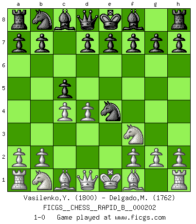Last move : 1-0 2013 January 19 0:36:28 [Event "FICGS__CHESS__RAPID_B__000202"] [Site "FICGS"] [Date "2012.12.07"] [Round "1"] [White "Vasilenko,Yaroslav"] [Black "Delgado,Mauricio"] [Result "1-0"] [WhiteElo "1800"] [BlackElo "1762"] 1.c4 c5 2.Nf3 Nf6 3.e4 Nxe4 4.d4 1-0 This chess game has been lost on time (started : 2012.12.07 3:42:23) English : Symmetrical variation Player White won this chess game. Follow this game move after move (download)Kasparov : J'adoube , Ivanchuk : S'il vous plaît ! (Garry Kasparov & Vassily Ivanchuk, Linares 1997) Ich brauche nur einen Blick auf das Schachbrett zu werfen, und weiß schon, was in der Stellung steckt, was geschehen kann und was geschehen wird. Alle übrigen suchen und prüfen, ich aber weiß es! (José Raúl Capablanca) Yo adoro todas la posiciones. Denme una partida posicional difÃcil, y la jugaré. Pero posiciones totalmente ganadas, no las tolero. (Hein Donner) Le temps de noter son nom sur la feuille de partie, j'étais déjà en zeitnot ! D'un modeste amateur apparié lors de la première ronde d'un open contre le grand-maître Azmaïparashvili. Establishing goals is all right if you don't let them deprive you of interesting detours. (Doug Larson)