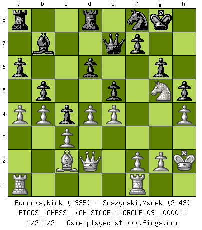 Last move : 1/2-1/2 2013 January 26 9:53:59 [Event "FICGS__CHESS__WCH_STAGE_1_GROUP_09__000011"] [Site "FICGS"] [Date "2012.12.09"] [Round "1"] [White "Burrows,Nick"] [Black "Soszynski,Marek"] [Result "1/2-1/2"] [WhiteElo "1935"] [BlackElo "2143"] 1.e4 e5 2.Nf3 Nc6 3.Bb5 a6 4.Ba4 Nf6 5.O-O Be7 6.Re1 b5 7.Bb3 d6 8.c3 O-O 9.h3 Nb8 10.d3 Nbd7 11.Nbd2 Bb7 12.Nf1 Nc5 13.Bc2 Re8 14.Ng3 Bf8 15.Be3 g6 16.a4 Ncd7 17.Qd2 c5 18.Bh6 Qe7 19.Bxf8 Qxf8 20.d4 c4 21.Red1 h6 22.h4 h5 23.Ng5 Qe7 24.b4 Red8 25.Nf1 Nf8 26.Nh2 Ng4 27.Rf1 Nxh2 28.Kxh2 1/2-1/2 Ruy Lopez : Closed Kingside Castling by player White (move 5) Kingside Castling by player Black (move 8) This chess game ended in a draw. Follow this game move after move (download)In Chess, as it is played by masters, chance is practically eliminated. (Emanuel Lasker) Ich moechte nie einem Club beitreten, der Leute wie mich als Mitglieder aufnimmt. (Woody Allen) Cuando veas una buena jugada, trata de encontrar otra mejor. (Emanuel Lasker) Votre prénom est 'Tactique', votre deuxième prénom est 'Tactique' et votre nom est 'Tactique'. (Ken Smith) The message for business people contemplating their place in the cyberspace is simple and direct: get linked or get lost. (Vic Sussman and Kenan Pollack)