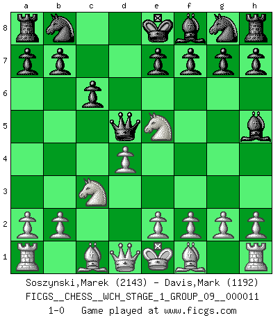 Last move : 1-0 2013 January 22 0:39:53 [Event "FICGS__CHESS__WCH_STAGE_1_GROUP_09__000011"] [Site "FICGS"] [Date "2012.12.09"] [Round "1"] [White "Soszynski,Marek"] [Black "Davis,Mark"] [Result "1-0"] [WhiteElo "2143"] [BlackElo "1192"] 1.d4 d5 2.c4 c6 3.Nf3 Bg4 4.Ne5 Bh5 5.cxd5 Qxd5 6.Nc3 1-0 This chess game has been lost on time (started : 2012.12.09 1:21:13) QGD Slav : 3.Nf3 Player White won this chess game. Follow this game move after move (download)I guess a certain amount of temperament is expected of Chess geniuses. (Ron Gross) Verschiedene, sehr schätzbare und im Laufe des Lebens nützliche Eigenschaften des Geistes können durch das Schachspiel erworben und gekräftigt werden, so dass sie zu Gewohnheiten werden, die uns nie im Stich lassen. (Benjamin Franklin) Con el tiempo, empecé a progresar en partidas decisivas. Tal vez porque me di cuenta de una simple verdad: no solo estaba yo nervioso sino también mi oponente. (Mikhail Tal) La vie est comme un jeu d'échecs : nous esquissons un plan, mais celui-ci est tributaire de ce que daignent faire l'adversaire aux échecs et le destin dans la vie. (Arthur Schopenhauer) A person who never made a mistake never tried anything new. (Albert Einstein)