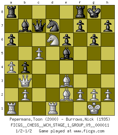 Last move : 1/2-1/2 2013 January 24 19:16:7 [Event "FICGS__CHESS__WCH_STAGE_1_GROUP_09__000011"] [Site "FICGS"] [Date "2012.12.09"] [Round "1"] [White "Pepermans,Toon"] [Black "Burrows,Nick"] [Result "1/2-1/2"] [WhiteElo "2000"] [BlackElo "1935"] 1.d4 Nf6 2.c4 g6 3.Nc3 d5 4.Nf3 Bg7 5.Qb3 dxc4 6.Qxc4 O-O 7.e4 a6 8.Be2 b5 9.Qb3 c5 10.dxc5 Bb7 11.e5 Nfd7 12.Be3 e6 13.O-O Nc6 14.Rfd1 Qc7 15.a4 b4 16.Ne4 Ncxe5 17.Nxe5 Bxe5 18.Nd6 1/2-1/2 King's Indian defense, 3.Nc3 Kingside Castling by player Black (move 6) Kingside Castling by player White (move 13) This chess game ended in a draw. Follow this game move after move (download)You know, comrade Pachman, I don't enjoy being a Minister, I would rather play Chess like you. (Che Guevara) Das Zentrum ist der Balkan des Schachbretts - Kriegshandlungen können in jedem Moment ausbrechen. (Aaron Nimzowitsch) La vida es como el Ajedrez, con lucha, competición y eventos buenos y malos. (Benjamin Franklin) Vous m'avez demandé de vous exposer quel est le fondement de la prière. Je ne fais que préparer les pièces du jeu sur la table... Nous sera-t-il permis d'en adopter les règles et si nous les appliquons scrupuleusement nous ne tarderons pas à faire mat le Roi divin ! Il ne pourra échapper à nos mains. (Sainte Thérèse d'Avila, Chemin de perfection) To steal ideas from one person is plagiarism. To steal from many is research. (Unknown)