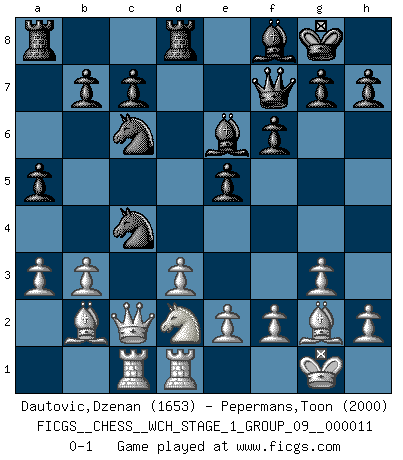 Last move : 0-1 2013 April 4 8:29:55 [Event "FICGS__CHESS__WCH_STAGE_1_GROUP_09__000011"] [Site "FICGS"] [Date "2012.12.09"] [Round "1"] [White "Dautovic,Dzenan"] [Black "Pepermans,Toon"] [Result "0-1"] [WhiteElo "1653"] [BlackElo "2000"] 1.c4 e5 2.g3 Nf6 3.Bg2 d5 4.cxd5 Nxd5 5.Nf3 Nc6 6.O-O Nb6 7.d3 Be7 8.Nbd2 O-O 9.a3 a5 10.b3 Be6 11.Bb2 f6 12.Qc2 Qd7 13.Rfd1 Rfd8 14.Rac1 Bf8 15.Nc4 Qf7 16.Nfd2 Nxc4 0-1 This chess game has been lost on time (started : 2012.12.09 1:21:13) English Opening Kingside Castling by player White (move 6) Kingside Castling by player Black (move 8) Player Black won this chess game. Follow this game move after move (download)Chess is played with the mind and not with the hands ! (Renaud and Kahn) Mein Name ist Rustam Kamsky. Sie haben meinen Sohn belästigt. Bereiten Sie sich aufs Sterben vor. (Rustam Kamsky) Yo siempre he tenido un ligero sentimiento de lástima por una persona que no tiene conocimiento del Ajedrez. (Siegbert Tarrasch) Les écrivains ont utilisé les échecs pour analyser les côtés extrêmes de la nature humaine. Dans ce cadre, les échecs offrent un champ d'expérimentation idéal. Mais on pourrait faire la même chose avec la peinture. Et là, en vous référant à Van Gogh, vous ne tirerez pas de conclusion définitive sur les peintres. (Gary Kasparov) Life is like a game of cards: the hand you are dealt represents determinism; the way you play it is free will. (Jawaharlal Nehru)