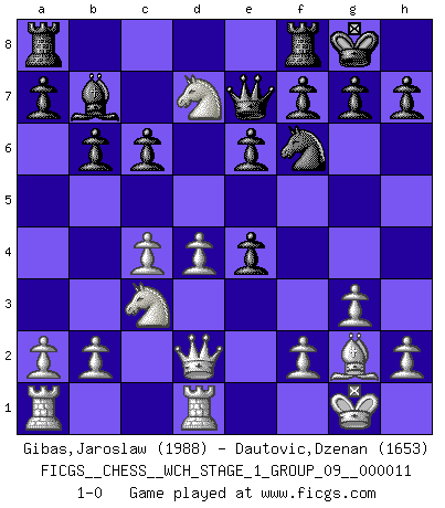 Last move : 1-0 2013 March 5 5:2:2 [Event "FICGS__CHESS__WCH_STAGE_1_GROUP_09__000011"] [Site "FICGS"] [Date "2012.12.09"] [Round "1"] [White "Gibas,Jaroslaw"] [Black "Dautovic,Dzenan"] [Result "1-0"] [WhiteElo "1988"] [BlackElo "1653"] 1.d4 Nf6 2.c4 e6 3.g3 Bb4+ 4.Bd2 Bxd2+ 5.Qxd2 d5 6.Nf3 c6 7.Bg2 Nbd7 8.O-O b6 9.Ne5 Bb7 10.Nc3 O-O 11.Rfd1 Qe7 12.e4 dxe4 13.Nxd7 1-0 Catalan Opening Kingside Castling by player White (move 8) Kingside Castling by player Black (move 10) Player White won this chess game. Follow this game move after move (download)Why must I lose to this idiot ? (Aron Nimzovich) Wenn Capablanka heute auf der Schachbühne erscheinen würde, hätte er ein halbes Jahr gebraucht um sich die Schachtheorie anzueignen. Und dann hätte er alles und jeden besiegt. (Mikhail Moiseyevich Botvinik) El Ajedrez es sobre todo, ¡una pelea!. (Emanuel Lasker) Un footballeur joue avec ses pieds, parfois avec sa tête. Un joueur d'échecs ne joue qu'avec sa tête. Et quand il ne joue plus, il meurt. (Jacob Murray) The ultimate in disposing one's troops is to be without ascertainable shape. Then the most penetrating spies cannot pry in nor can the wise lay plans against you. (Sun Tzu)