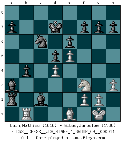 Last move : 0-1 2012 December 27 16:4:52 [Event "FICGS__CHESS__WCH_STAGE_1_GROUP_09__000011"] [Site "FICGS"] [Date "2012.12.09"] [Round "1"] [White "Bain,Mathieu"] [Black "Gibas,Jaroslaw"] [Result "0-1"] [WhiteElo "1616"] [BlackElo "1988"] 1.e4 e6 2.d4 d5 3.e5 c5 4.Nf3 Nc6 5.Bb5 Qb6 6.Bxc6+ bxc6 7.Nc3 Ba6 8.Be3 Qxb2 9.Na4 Qa3 10.c3 Bb5 11.Bc1 Qxa4 12.Qxa4 Bxa4 13.O-O cxd4 14.cxd4 Rb8 15.Bd2 Kd7 16.Rab1 Rb5 17.Bc3 Ba3 18.Rxb5 cxb5 19.Rb1 Ne7 20.Ng5 Rc8 21.Bd2 Rc2 22.Ba5 Nc6 23.Be1 Rxa2 24.Nf3 b4 25.h3 Bc2 0-1 French : Advance, Nimzovich system Kingside Castling by player White (move 13) Player Black won this chess game. Follow this game move after move (download)You have to have the fighting spirit. You have to force moves and take chances. (Bobby Fischer) Die größte Kunst beim Schach besteht darin dem Gegner nicht zu zeigen was er tun kann. (Garry Kasparov) Una clavada es mas poderosa que una espada. (Fred Reinfeld) Il vaut toujours mieux jouer un plan faux de façon logique que de n'avoir pas de plan du tout. (Victor Kortchnoï) Creativity is inventing, experimenting, growing, taking risks, breaking rules, making mistakes, and having fun. (Mary Lou Cook)