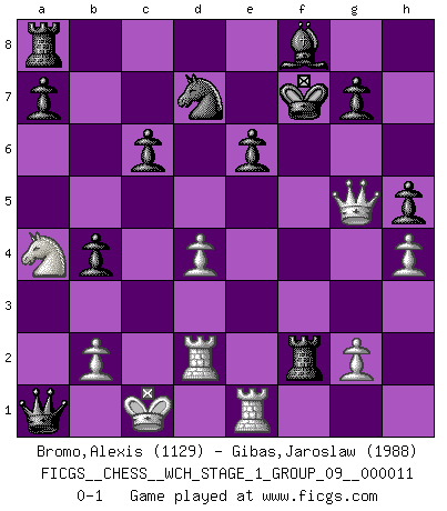 Last move : 0-1 2012 December 13 21:18:35 [Event "FICGS__CHESS__WCH_STAGE_1_GROUP_09__000011"] [Site "FICGS"] [Date "2012.12.09"] [Round "1"] [White "Bromo,Alexis"] [Black "Gibas,Jaroslaw"] [Result "0-1"] [WhiteElo "1129"] [BlackElo "1988"] 1.d4 d5 2.c4 c6 3.Nc3 Nf6 4.Bg5 dxc4 5.e4 b5 6.Nf3 b4 7.Na4 Nxe4 8.Bxc4 Nxg5 9.Nxg5 e6 10.h4 h6 11.Nxe6 Bxe6 12.Bxe6 fxe6 13.Qh5+ Ke7 14.O-O-O Qd5 15.Qg4 Nd7 16.Rhe1 h5 17.Qg6 Rh6 18.Qg3 Qxa2 19.Qg5+ Kf7 20.Qf4+ Rf6 21.Qg5 Rxf2 22.Rd2 Qa1+ 0-1 QGD Slav defense Queenside Castling by player White (move 14) Player Black won this chess game. Follow this game move after move (download)All my games are real. (Bobby Fischer) Darum geht es im Schach. Einen Tag gibst du deinem Gegner eine Lektion, am nächsten Tag gibt er dir eine. (Robert James Fischer) El Ajedrez es de 30 a 40 por ciento psicología. Uno no cuenta con esto cuando se juega contra una computadora. No lo puedo confundir. (Judith Polgar) Les échecs, c'est l'imagination. (David Bronstein) Home computers are being called upon to perform many new functions, including the consumption of homework formerly eaten by the dog. (Doug Larson)