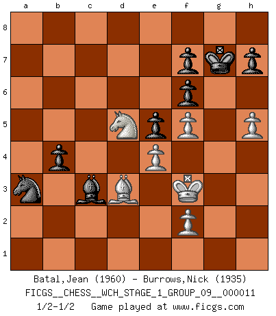 Last move : 1/2-1/2 2013 February 24 21:49:14 [Event "FICGS__CHESS__WCH_STAGE_1_GROUP_09__000011"] [Site "FICGS"] [Date "2012.12.09"] [Round "1"] [White "Batal,Jean"] [Black "Burrows,Nick"] [Result "1/2-1/2"] [WhiteElo "1960"] [BlackElo "1935"] 1.Nf3 d5 2.g3 Nf6 3.Bg2 c6 4.O-O Bg4 5.d3 Nbd7 6.Nbd2 e5 7.e4 dxe4 8.dxe4 Bc5 9.h3 Bh5 10.Qe1 O-O 11.Nc4 Re8 12.a4 b5 13.Na5 Qc7 14.Nh4 a6 15.Nb3 Bf8 16.Bg5 Nb6 17.axb5 cxb5 18.Bxf6 gxf6 19.c3 Red8 20.Nf5 Nc4 21.g4 Bg6 22.Qe2 a5 23.Rad1 a4 24.Nc1 a3 25.bxa3 Qa5 26.a4 Qxa4 27.h4 Rac8 28.Rd3 Qa3 29.Qd1 Qa5 30.Nb3 Rxd3 31.Qxd3 Qa4 32.Nc1 Bxf5 33.gxf5 Bd6 34.Qe2 Qa3 35.Qd3 Rd8 36.Qc2 Qa4 37.Nb3 Bc5 38.h5 Bb6 39.Ra1 Rd2 40.Qxd2 Qxa1+ 41.Nxa1 Nxd2 42.Nc2 Nb1 43.Nb4 Ba5 44.Nd5 Bxc3 45.Bf1 b4 46.Bd3 Na3 47.Kg2 Kh8 48.Kf3 Kg7 1/2-1/2 Reti : King's Indian attack, Yugoslav variation Kingside Castling by player White (move 4) Kingside Castling by player Black (move 10) This chess game ended in a draw. Follow this game move after move (download)The sign of a great Master is his ability to win a won game quickly and painlessly. (Irving Chernev) Ein guter Spieler hat immer Glück. (José Raúl Capablanca) Tu sabes, camarada Pachman, no disfruto el ser un Ministro, preferería jugar al Ajedrez como tu. (Che Guevara) Toute estimation doit être constamment réévaluée. (Jacob Estrin) If only people were all showed a certain minimum level of niceness; if only people didn't retract verbal draw offers (without draw box ticked) on ficgs; if only people didn't kill; if only people didn't run concentration / extermination camps, if only people didn't drop nuclear bombs on Hiroshima and Nagasaki, and so on - it would be a much more beautiful world. But sadly, things are not so... (Normajean Yates)