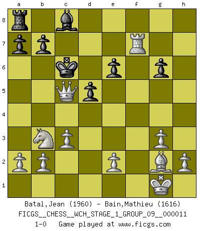 Last move : 1-0 2012 December 25 18:43:47 [Event "FICGS__CHESS__WCH_STAGE_1_GROUP_09__000011"] [Site "FICGS"] [Date "2012.12.09"] [Round "1"] [White "Batal,Jean"] [Black "Bain,Mathieu"] [Result "1-0"] [WhiteElo "1960"] [BlackElo "1616"] 1.Nf3 Nf6 2.g3 d5 3.Bg2 e6 4.O-O Bc5 5.d3 c6 6.Nbd2 Qb6 7.c3 Bxf2+ 8.Rxf2 Ng4 9.d4 c5 10.dxc5 Qxc5 11.Qa4+ Nc6 12.Qxg4 O-O 13.Nb3 Qb6 14.Bh6 g6 15.Qh4 Qd8 16.Bxf8 Qxf8 17.Ng5 h6 18.Rxf7 Qxf7 19.Nxf7 Kxf7 20.Rf1+ Ke8 21.Qxh6 Ne7 22.Qf8+ Kd7 23.Rf7 Kd6 24.Qxe7+ Kc6 25.Qc5+ 1-0 Reti Opening Kingside Castling by player White (move 4) Kingside Castling by player Black (move 12) Player White won this chess game. Follow this game move after move (download)Fischer was a master of clarity and a king of artful positioning. His opponents would see where he was going but were powerless to stop him. (Bruce Pandolfini) Frage des Reporters: -Welche besonderen Umstände rechtfertigen das Anhalten der Uhren während einer Turnierpartie? Antwort: -Einen Fotographen zu strangulieren. (Siegbert Tarrasch) Después de la respuesta de las negras a 1.e4 con 1..e5, se quedan siempre tratando de entrar dentro del juego. (Howard Staunton) Le succès, c'est être capable d'aller d'échec en échec sans perdre son enthousiasme. (Winston Churchill) I take risks, sometimes patients die, but not taking risks causes more patients to die. So I guess my biggest problem is I've been cursed with the ability to do the math. (Gregory House, House M.D.)