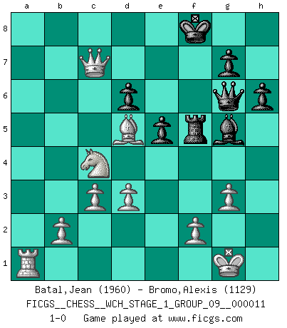 Last move : 1-0 2012 December 15 16:48:45 [Event "FICGS__CHESS__WCH_STAGE_1_GROUP_09__000011"] [Site "FICGS"] [Date "2012.12.09"] [Round "1"] [White "Batal,Jean"] [Black "Bromo,Alexis"] [Result "1-0"] [WhiteElo "1960"] [BlackElo "1129"] 1.Nf3 d6 2.g3 e5 3.d3 Nf6 4.Bg2 Nc6 5.O-O Be7 6.e4 Bg4 7.c3 a6 8.h3 Bh5 9.Nbd2 b5 10.a4 bxa4 11.Qxa4 Qd7 12.Nc4 O-O 13.Bg5 h6 14.Bxf6 Bxf6 15.Na5 Bxf3 16.Bxf3 Qxh3 17.Qxc6 Bg5 18.Nc4 f5 19.Bg2 Qh5 20.exf5 Rae8 21.Rxa6 Rxf5 22.Ra8 Rxa8 23.Qxa8+ Kf7 24.Bd5+ Ke7 25.Qc8 Qg6 26.Qxc7+ Kf8 27.Ra1 1-0 Reti Opening Kingside Castling by player White (move 5) Kingside Castling by player Black (move 12) Player White won this chess game. Follow this game move after move (download)You are for me the Queen on d8 and I am the Pawn on d7 !! (Eduard Gufeld) Der zweitbeste Zug ist oft der einzig richtige. (Savielly Grigorievitsch Tartakower) Si el Ajedrez es una ciencia, es la mas inexacta. Si el Ajedrez es un arte, es demasiado inexacto para ser visto como tal. Si el Ajedrez es un deporte, es demasiado esotérico. Si el Ajedrez es un juego, es demasiado exigente para ser solo un juego. Si el Ajedrez es una aventura, es una muy demandante. Si el Ajedrez es una pasión, es una muy gratificante. Si el Ajedrez es la vida, es una muy triste. (Anónimo) Karpov est une pièce de musée. (Garry Kasparov) A good book on your shelf is a friend that turns its back on you and remains a friend. (Author unknown)