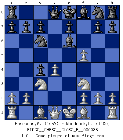 Last move : 1-0 2007 March 2 12:15:49 [Event "FICGS__CHESS__CLASS_F__000025"] [Site "FICGS"] [Date "2007.01.19"] [Round "1"] [White "Barradas,Anderson"] [Black "Woodcock,Christine"] [Result "1-0"] [WhiteElo "1059"] [BlackElo "1400"] 1.d4 d5 2.c4 dxc4 3.Nf3 Be6 4.Nc3 Nc6 5.e4 f5 6.exf5 1-0 This chess game has been lost on time (started : 2007.01.19 18:49:8) QGA : 3.Nf3 Player White won this chess game. Follow this game move after move (download)I had a toothache during the first game. In the second game I had a headache. In the third game it was an attack of rheumatism. In the fourth game, I wasn't feeling well. And in the fifth game? Well, must one have to win every game ? (Siegbert Tarrasch) Über Kasparov: Es ist offensichtlich, daß er in einem totalitären Staat aufwuchs und deshalb zu diktatorischen Zügen neigt. (Viktor Kortschnoi) La enorme capacidad mental, en la que sin ella no puede un jugador de Ajedrez existir, es demasiado requerida por el Ajedrez al grado de que nunca podrá liberar su mente de este juego. (Albert Einstein) C'est une question de caractère, Beaucoup de gens perdent leur motivation très vite. D'autres, ils sont rares, peuvent la conserver très longtemps. J'aime les échecs, encore aujourd'hui je suis heureux d'analyser des parties. J'aime toujours gagner, je déteste encore perdre. Bien jouer est important pour mon intégrité intellectuelle et morale. Et puis les échecs vivent en ce moment une période historique grâce à Internet. Ils se développent dans les systèmes éducatifs à travers le monde. Ils sortent de leur ghetto, et c'est mon rôle de mener à bien cette révolution. (Gary Kasparov) The large trees attract high winds. (Chinese proverb)