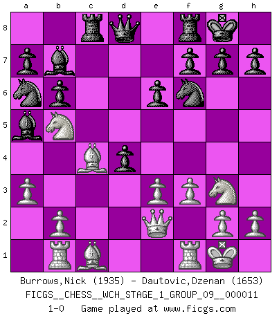 Last move : 1-0 2013 March 9 5:19:42 [Event "FICGS__CHESS__WCH_STAGE_1_GROUP_09__000011"] [Site "FICGS"] [Date "2012.12.09"] [Round "1"] [White "Burrows,Nick"] [Black "Dautovic,Dzenan"] [Result "1-0"] [WhiteElo "1935"] [BlackElo "1653"] 1.d4 Nf6 2.c4 e6 3.Nc3 Bb4 4.e3 c5 5.Nge2 b6 6.a3 Ba5 7.Rb1 Na6 8.Ng3 Bb7 9.f3 O-O 10.Bd3 d5 11.O-O cxd4 12.Nb5 dxc4 13.Bxc4 Rc8 14.Qe2 1-0 Nimzo-Indian : 4.e3 c5 Kingside Castling by player Black (move 9) Kingside Castling by player White (move 11) Player White won this chess game. Follow this game move after move (download)War is the child of passion, passion is the child of narcissism and narcissism is the child. (...) Another game ? (Thibault de Vassal) Es war undenkbar für die Behörden, dass ein sowjetischer Großmeister auf diese Art und Weise [Fischer-Taimanov 6:0] verliert, ohne dass es eine politischer Erklärung dafür gäbe. (Mark Taimanov) Cualquier cambio de material en una posición debe venir por medio de un mate, una captura o promoción de Peón. (Purdy) Avec des compensations pour le matériel en plus... (Anonyme) First of all, we have to go back to the classical time control. (Anatoly Karpov)