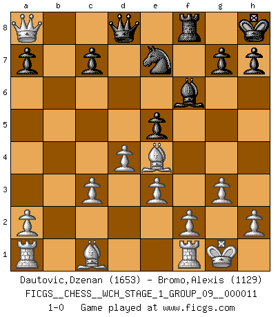 Last move : 1-0 2012 December 14 7:20:16 [Event "FICGS__CHESS__WCH_STAGE_1_GROUP_09__000011"] [Site "FICGS"] [Date "2012.12.09"] [Round "1"] [White "Dautovic,Dzenan"] [Black "Bromo,Alexis"] [Result "1-0"] [WhiteElo "1653"] [BlackElo "1129"] 1.c4 e5 2.g3 Nf6 3.Bg2 d5 4.cxd5 Nxd5 5.Nf3 Nc6 6.O-O Be6 7.d4 e4 8.Ng5 Be7 9.Nxe6 fxe6 10.Bxe4 O-O 11.Nc3 Bf6 12.e3 Nxc3 13.bxc3 e5 14.Qb3+ Kh8 15.Qxb7 Ne7 16.Qxa8 1-0 English Opening Kingside Castling by player White (move 6) Kingside Castling by player Black (move 10) Player White won this chess game. Follow this game move after move (download)Capture of the adverse King is the ultimate but not the first object of the game. (William Steinitz) Die Fehler sind da, Sie warten nur darauf gemacht zu werden. (Savielly Grigorievitsch Tartakower) La vida es como un juego de Ajedrez, cambiando con cada movimiento. (Proverbio Chino) RxDa4 pat (...) There are two types of people in this world, good and bad. The good sleep better, but the bad seem to enjoy the waking hours much more. (Woody Allen)