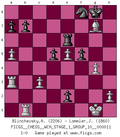 Last move : 1-0 2013 May 1 9:45:1 [Event "FICGS__CHESS__WCH_STAGE_1_GROUP_10__000011"] [Site "FICGS"] [Date "2012.12.09"] [Round "1"] [White "Blinchevsky,Alexander"] [Black "Lommler,Jan Peter"] [Result "1-0"] [WhiteElo "2206"] [BlackElo "1860"] 1.d4 d5 2.c4 c6 3.Nf3 Nf6 4.Nc3 dxc4 5.a4 Bf5 6.e3 e6 7.Bxc4 Bb4 8.O-O O-O 9.Qe2 h6 10.Rd1 Bh7 11.Bd3 Bxd3 12.Rxd3 Nbd7 13.e4 Qa5 14.e5 Nd5 15.Nh4 Bxc3 16.bxc3 f5 17.Qh5 f4 18.Qg4 Rae8 19.Ng6 Qa6 20.Rh3 Rf7 21.Nxf4 Qc4 22.Nxd5 exd5 23.Qh5 Re6 24.f4 Qb3 25.Qe2 c5 26.a5 Nf8 27.Rf3 g6 28.g4 Rg7 29.Ra3 Qb1 30.Rf1 cxd4 31.f5 gxf5 32.Bxh6 d3 33.Rxb1 dxe2 34.Bxg7 1-0 This chess game has been lost on time (started : 2012.12.09 1:24:52) QGD Slav : Dutch variation Kingside Castling by player White (move 8) Kingside Castling by player Black (move 8) Player White won this chess game. Follow this game move after move (download)In Fischer's hands, a slight theoretical advantage is as good a being a Queen ahead. (Isaac Kashdan) Ich kenne keine einzige Person, die behaupten würde, Garri Kasparow sei ein guter Mensch (Nigel Short) Después de la respuesta de las negras a 1.e4 con 1..e5, se quedan siempre tratando de entrar dentro del juego. (Howard Staunton) Même si l'adversaire joue le coup analysé précédemment, recommencez l'analyse en voyant la nouvelle position. Première règle de Blumenfeld When you stop learning you start dying. (M. Scott Adams)