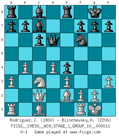 Last move : 0-1 2013 January 31 17:54:30 [Event "FICGS__CHESS__WCH_STAGE_1_GROUP_10__000011"] [Site "FICGS"] [Date "2012.12.09"] [Round "1"] [White "Rodriguez,Juan Antonio"] [Black "Blinchevsky,Alexander"] [Result "0-1"] [WhiteElo "1800"] [BlackElo "2206"] 1.d4 d5 2.c4 c6 3.e3 Nf6 4.Nc3 e6 5.Nf3 Nbd7 6.cxd5 exd5 7.Bd3 Bd6 8.a3 O-O 9.O-O Re8 10.Qc2 Qe7 11.h3 Ne4 12.Nd2 Ndf6 13.Ndxe4 dxe4 14.Be2 Bc7 15.b4 Qd6 0-1 QGD Slav defense Kingside Castling by player Black (move 8) Kingside Castling by player White (move 9) Player Black won this chess game. Follow this game move after move (download)Methodical thinking is of more use in Chess than inspiration. (C. J. S. Purdy) Schon mancher Spieler hat aufgegeben, um zu vermeiden, daß er eine Figur verliert. (Savielly Grigorievitsch Tartakower) El Ajedrez es tortura mental. (Garry Kasparov) Les échecs sont plus proches de l'art de l'assassinat que de l'art de la guerre. (Arturo Perez-Reverte) In fact if nothing is done against this teddy bear, hereby I announce that I would quit chess, rapid chess, blitz chess, postal chess, email chess, server chess and correspondence chess I will then switch to a table game where teddy bears aren't going to be seen for a while, like Poker, or Roulette, all 18+ games. (Elmer Valderrama)