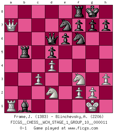 Last move : 0-1 2012 December 27 20:30:37 [Event "FICGS__CHESS__WCH_STAGE_1_GROUP_10__000011"] [Site "FICGS"] [Date "2012.12.09"] [Round "1"] [White "Frame,Jeremy"] [Black "Blinchevsky,Alexander"] [Result "0-1"] [WhiteElo "1383"] [BlackElo "2206"] 1.e4 c6 2.d4 d5 3.exd5 cxd5 4.Bd3 Nc6 5.c3 Nf6 6.Bf4 Bg4 7.Nf3 e6 8.Nbd2 Bd6 9.Bxd6 Qxd6 10.O-O O-O 11.Be2 Rab8 12.h3 Bf5 13.Re1 b5 14.a4 bxa4 15.Qxa4 Rxb2 16.Bb5 Ne7 17.Qxa7 Rxb5 18.Reb1 Bxb1 0-1 Caro-Kann : Exchange, Rubinstein variation Kingside Castling by player White (move 10) Kingside Castling by player Black (move 10) Player Black won this chess game. Follow this game move after move (download)By the beauty of his games, the clarity of his play, and the brilliance of his ideas, Fischer made himself an artist of the same stature as Brahms, Rembrandt, and Shakespeare. (David Levy) Wer mein Gambit spielt, muß bereit sein, alle Brücken hinter sich abzubrechen. Es verändert den ganzen Menschen. Es wirkt wie ein Zauberstab und fördert verkümmerte, gute Charakter- eigenschaften wieder zu Tage. (Emil Joseph Diemer) Yo siempre he tenido un ligero sentimiento de lástima por una persona que no tiene conocimiento del Ajedrez. (Siegbert Tarrasch) Je crois qu'il existe des manières très spécifiques de jouer efficacement contre une machine. Evidemment, nous n'avons aucune chance en technique pure, parce que l'ordinateur calcule de manière parfaite. Mais lorsque nous faisons appel à notre cerveau, en utilisant l'intuition et la compréhension, alors nous restons beaucoup plus forts. (Anatoli Karpov) The production of too many useful things results in too many useless people. (Karl Marx)