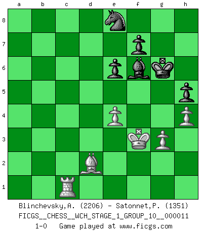 Last move : 1-0 2013 April 17 12:37:40 [Event "FICGS__CHESS__WCH_STAGE_1_GROUP_10__000011"] [Site "FICGS"] [Date "2012.12.09"] [Round "1"] [White "Blinchevsky,Alexander"] [Black "Satonnet,Patrick"] [Result "1-0"] [WhiteElo "2206"] [BlackElo "1351"] 1.d4 d5 2.c4 dxc4 3.Nf3 Nf6 4.g3 e6 5.Bg2 c5 6.O-O Nc6 7.Qa4 Be7 8.dxc5 Bxc5 9.Ne5 Bd7 10.Nxc6 Qb6 11.Nd2 Bxc6 12.Bxc6+ bxc6 13.Nxc4 Qb5 14.Qc2 O-O 15.b3 Bd4 16.Rb1 Rad8 17.e3 Bc5 18.Bb2 Be7 19.a4 Qa6 20.b4 Nd5 21.b5 cxb5 22.axb5 Qc8 23.Qb3 Nb4 24.Na5 Qc7 25.Qc3 Qxc3 26.Bxc3 Nd5 27.Bd4 Rd7 28.Nc6 Bf6 29.Bxa7 Rc7 30.Bc5 Ra8 31.Rb3 Nc3 32.b6 Rxc6 33.b7 Rb8 34.Ba7 Rxb7 35.Rxb7 g5 36.Kg2 h5 37.Rc1 Ra6 38.Bc5 Ra2 39.Ra7 Rxa7 40.Bxa7 Kh7 41.Bb6 g4 42.Ba5 Ne4 43.f3 gxf3+ 44.Kxf3 Ng5+ 45.Ke2 Kg6 46.h4 Ne4 47.Kf3 Nd6 48.e4 Ne8 49.Bd2 1-0 Queen's gambit accepted Kingside Castling by player White (move 6) Kingside Castling by player Black (move 14) Player White won this chess game. Follow this game move after move (download)The defensive power of a pinned piece is only imaginary. (Aaron Nimzovich) Der Schachmeister von Heute braucht Courage, einen Killerinstinkt, Ausdauer und Arroganz. (Larry Evans) Muchos jugadores de Ajedrez se sorprendían cuando después de la partida, Fischer explicaba con calma: 'Yo ya había analizado esta posibilidad' en una posición en la cual yo creía que no era posible de prever desde la apertura. (Mikhail Tal) Ce n'est pas pour s'amuser qu'il joue aux échecs : il célèbre un culte. (Vladimir Nabokov) Every now and then a man's mind is stretched by a new idea and never shrinks back to its former dimensions. (Oliver Wendell Holmes, Sr.)