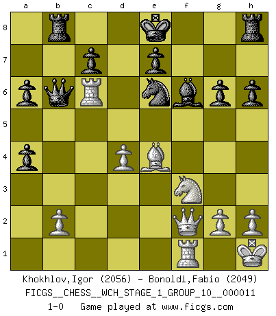 Last move : 1-0 2013 April 4 12:54:42 [Event "FICGS__CHESS__WCH_STAGE_1_GROUP_10__000011"] [Site "FICGS"] [Date "2012.12.09"] [Round "1"] [White "Khokhlov,Igor"] [Black "Bonoldi,Fabio"] [Result "1-0"] [WhiteElo "2056"] [BlackElo "2049"] 1.e4 g6 2.d4 Bg7 3.Nc3 d6 4.Be3 a6 5.Qd2 b5 6.Bd3 Nd7 7.Nf3 Bb7 8.O-O Ngf6 9.e5 Ng4 10.e6 fxe6 11.Ng5 Nf8 12.Qe2 Nxe3 13.fxe3 Bf6 14.Nce4 h6 15.Nf3 Qd7 16.a4 bxa4 17.Qf2 Bxe4 18.Bxe4 d5 19.Bd3 Qc6 20.c4 Rb8 21.Rac1 Qd6 22.cxd5 exd5 23.e4 dxe4 24.Bxe4 Qb6 25.Kh1 Ne6 26.Rc6 1-0 Robatsch (Modern) defense Kingside Castling by player White (move 8) Player White won this chess game. Follow this game move after move (download)I had a toothache during the first game. In the second game I had a headache. In the third game it was an attack of rheumatism. In the fourth game, I wasn't feeling well. And in the fifth game? Well, must one have to win every game ? (Siegbert Tarrasch) Über Karpov: Er war und ist ein Vertreter der russischen Reaktionäre. Das steckt tief in seiner Seele, wehalb ich nicht nett mit ihm umgehen kann. (Viktor Kortschnoi) ¿Porque tengo que perder ante este idiota?. (Aron Nimzovich) Horreur, mais aussi harmonie suprême : qu'y avait-il en effet au monde en dehors des échecs ? Le brouillard, l'inconnu, le non-être... (Vladimir Nabokov) When a man with money meets a man with experience, the man with experience leaves with money and the man with money leaves with experience. (Anonymous)