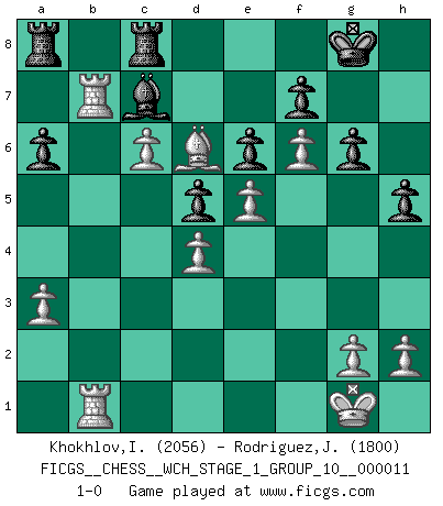 Last move : 1-0 2013 April 6 12:48:33 [Event "FICGS__CHESS__WCH_STAGE_1_GROUP_10__000011"] [Site "FICGS"] [Date "2012.12.09"] [Round "1"] [White "Khokhlov,Igor"] [Black "Rodriguez,Juan Antonio"] [Result "1-0"] [WhiteElo "2056"] [BlackElo "1800"] 1.e4 c6 2.d4 d5 3.e5 Bf5 4.Nf3 e6 5.Be2 Ne7 6.O-O h6 7.Nbd2 Nd7 8.Nb3 a6 9.Bd2 c5 10.Nxc5 Nxc5 11.dxc5 Nc6 12.b4 Be7 13.Bc3 O-O 14.Nd4 Bh7 15.a3 Qc7 16.Nxc6 Qxc6 17.Bd4 Be4 18.Bd3 Bxd3 19.Qxd3 Qb5 20.f4 Qxd3 21.cxd3 Rac8 22.f5 Rc7 23.f6 Bd8 24.Rf3 g6 25.Rf2 h5 26.Rb1 Rc8 27.b5 Ba5 28.bxa6 bxa6 29.Rfb2 Bc7 30.Rb7 Rb8 31.c6 Rfc8 32.Ba7 Ra8 33.d4 Kf8 34.Bc5+ Kg8 35.Bd6 1-0 Caro-Kann : Advance variation Kingside Castling by player White (move 6) Kingside Castling by player Black (move 13) Player White won this chess game. Follow this game move after move (download)Chess is a part of culture and if a culture is declining then Chess too will decline. (Mikhail Botvinnik) Ich würde mich als ganz normalen Jungen bezeichnen [Im Alter von 12]. (Sergej Karjakin) El Ajedrez es una manera fabulosa para que los niños aprendan a autovalorarse y a autoestimarse. (Saudin Robovic) La vie est comme un jeu d'échecs : nous esquissons un plan, mais celui-ci est tributaire de ce que daignent faire l'adversaire aux échecs et le destin dans la vie. (Arthur Schopenhauer) A belief is an idea the mind possesses, an idea that possesses the mind. (Robert Oxden Bolton)