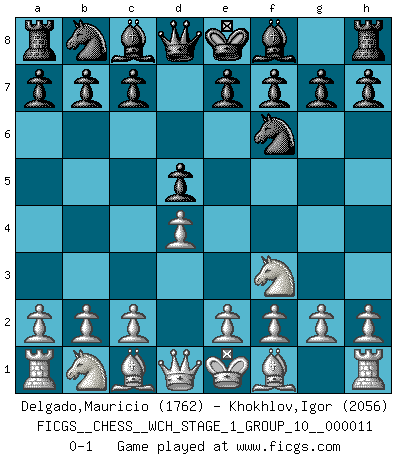 Last move : 0-1 2013 January 20 0:36:32 [Event "FICGS__CHESS__WCH_STAGE_1_GROUP_10__000011"] [Site "FICGS"] [Date "2012.12.09"] [Round "1"] [White "Delgado,Mauricio"] [Black "Khokhlov,Igor"] [Result "0-1"] [WhiteElo "1762"] [BlackElo "2056"] 1.d4 d5 2.Nf3 Nf6 0-1 This chess game has been lost on time (started : 2012.12.09 1:24:52) Queen's pawn game Player Black won this chess game. Follow this game move after move (download)What is the difference between chess and football? Everybody understands football, but nobody plays it. Everybody plays chess, but nobody understands it. Everything is relative. (Vladimir Kramnik) Mutter, ich bin eben Ex-Weltmeister geworden. --beim nach Hause Kommen nach dem Verlust des WM-Titels an Mihail Botvinnik -- (Mikhail Nekhemyevich Tal) La vida es como un juego de Ajedrez, cambiando con cada movimiento. (Proverbio Chino) Roi des jeux et jeu des rois, les échecs portent en eux un sentiment d'infini. Ils donnent à celui qui s'est efforcé d'en approfondir les arcanes l'impression de n'être pas à la mesure de l'homme; en fait, ils constituent un résumé de l'univers, un microcosme, et figurent cette grande échelle qui, dans les plans de la lumière descend jusqu'à la matière, qui des abîmes insondables remonte jusqu'en l'infini de Dieu. (Pyrame) Beta. Software undergoes beta testing shortly before it's released. Beta is latin for still doesn't work. (Anonymous)