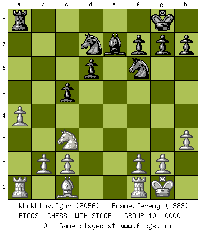 Last move : 1-0 2013 January 5 20:24:25 [Event "FICGS__CHESS__WCH_STAGE_1_GROUP_10__000011"] [Site "FICGS"] [Date "2012.12.09"] [Round "1"] [White "Khokhlov,Igor"] [Black "Frame,Jeremy"] [Result "1-0"] [WhiteElo "2056"] [BlackElo "1383"] 1.e4 e5 2.Nf3 Nf6 3.Nxe5 d6 4.Nf3 Nxe4 5.d4 Bg4 6.h3 Bxf3 7.Qxf3 Nf6 8.Qxb7 Nbd7 9.Nc3 Be7 10.Be2 O-O 11.O-O c5 12.Bf3 Qb6 13.Qxb6 axb6 14.Bxa8 Rxa8 15.dxc5 bxc5 16.a4 1-0 Petrov : Classical attack Kingside Castling by player Black (move 10) Kingside Castling by player White (move 11) Player White won this chess game. Follow this game move after move (download)Many Chess players were surprised when after the game, Fischer quietly explained: 'I had already analyzed this possibility' in a position which I thought was not possible to foresee from the opening. (Mikhail Tal) Intelligenz läßt sich nicht am Weg, sondern nur am Ergebnis feststellen. (Garry Kasparov) Cada Peón es potencialmente una Reina. (James Mason) Tout change constamment, y compris dans le monde des Echecs. (Botvinnik) Opportunities multiply as they are seized. (Sun Tzu)