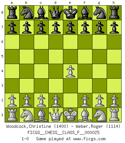 Last move : 1-0 2007 March 6 12:43:49 [Event "FICGS__CHESS__CLASS_F__000025"] [Site "FICGS"] [Date "2007.01.19"] [Round "1"] [White "Woodcock,Christine"] [Black "Weber,Roger"] [Result "1-0"] [WhiteElo "1400"] [BlackElo "1114"] 1.e4 1-0 This chess game has been lost on time (started : 2007.01.19 18:49:8) King's pawn Opening Player White won this chess game. Follow this game move after move (download)Let the perfectionist play postal. (Yasser Seirawan) Weshalb minderdergeübte Spieler mit g2-g4 beginnen? Die betreffenden sind unschlüssig, ob sie nun rechts (h4) oder links (f4) beginnen sollen, und in ihrer Ratlosigkeit entschliessen sie sich nach guter Bürgerart dazu, den goldenen Mittelweg zu wählen. (Aaron Nimzowitsch) En el Ajedrez, cuando menos, el valiente hereda la tierra. (Edmar Mednis) Roi des jeux et jeu des rois, les échecs portent en eux un sentiment d'infini. Ils donnent à celui qui s'est efforcé d'en approfondir les arcanes l'impression de n'être pas à la mesure de l'homme; en fait, ils constituent un résumé de l'univers, un microcosme, et figurent cette grande échelle qui, dans les plans de la lumière descend jusqu'à la matière, qui des abîmes insondables remonte jusqu'en l'infini de Dieu. (Pyrame) You must have a dream in order to have it come true. (A.P.J. Kalam)