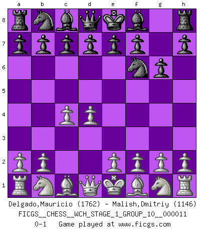 Last move : 0-1 2013 February 7 14:1:22 [Event "FICGS__CHESS__WCH_STAGE_1_GROUP_10__000011"] [Site "FICGS"] [Date "2012.12.09"] [Round "1"] [White "Delgado,Mauricio"] [Black "Malish,Dmitriy"] [Result "0-1"] [WhiteElo "1762"] [BlackElo "1146"] 1.c4 Nf6 2.d4 g6 0-1 This chess game has been lost on time (started : 2012.12.09 1:24:52) English, 1...Nf6 (Anglo-Indian defense) Player Black won this chess game. Follow this game move after move (download)Adequate compensation for a sacrifice is having a sound combination leading to a winning position; adequate compensation for a blunder is having your opponent snatch defeat from the jaws of victory. (Bruce A. Moon) Irgendwie scheint mir sonntags früh um 9 Uhr der Killerinstinkt verloren gegangen zu sein. (Alexej Shirov) Cuando tengo las piezas blancas, yo gano porque soy blanco; Cuando tengo las piezas negras, yo gano porque soy Bogolyubov. (Bogolyubov) Tout change constamment, y compris dans le monde des Echecs. (Botvinnik) Life is the sum of all your choices. (Albert Camus)