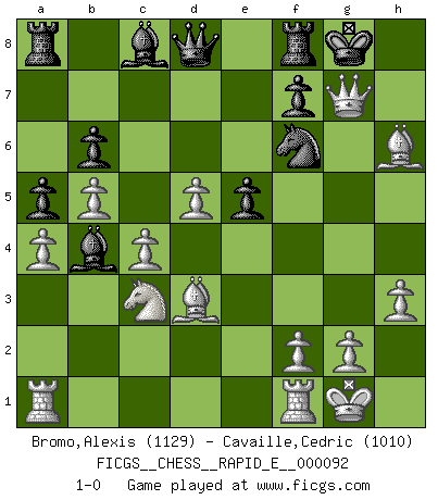 Last move : 1-0 2012 December 12 20:57:24 [Event "FICGS__CHESS__RAPID_E__000092"] [Site "FICGS"] [Date "2012.12.09"] [Round "1"] [White "Bromo,Alexis"] [Black "Cavaille,Cedric"] [Result "1-0"] [WhiteElo "1129"] [BlackElo "1010"] 1.d4 Nf6 2.c4 d6 3.Nc3 c5 4.e3 cxd4 5.exd4 e6 6.Nf3 Nc6 7.Bg5 Be7 8.h3 e5 9.d5 Nb8 10.b4 a6 11.Bd3 O-O 12.O-O a5 13.b5 b6 14.a4 h6 15.Be3 Nh5 16.Nxe5 dxe5 17.Qxh5 Nd7 18.Bxh6 Nf6 19.Qg5 Bb4 20.Qxg7+ 1-0 Old Indian defense Kingside Castling by player Black (move 11) Kingside Castling by player White (move 12) Player White won this chess game. Follow this game move after move (download)With or without the title, Bobby Fischer was unquestionably the greatest player of his time. (Burt Hochberg) Man braucht nicht immer den besten Zug zu spielen: Ein Zug muß aktiv, unternehmungslustig, korrekt und schön sein. (David Bronstein) Robert Fischer es la ley hacia si mismo. (Larry Evans) Les échecs, c'est la lutte contre l'erreur. (Johannes Zukertort) Games, world of games... There's always an opponent, and there's always a victim. (Revolver, movie)