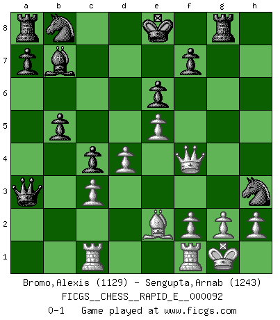 Last move : 0-1 2012 December 15 14:58:55 [Event "FICGS__CHESS__RAPID_E__000092"] [Site "FICGS"] [Date "2012.12.09"] [Round "1"] [White "Bromo,Alexis"] [Black "Sengupta,Arnab"] [Result "0-1"] [WhiteElo "1129"] [BlackElo "1243"] 1.d4 d5 2.c4 c6 3.Nc3 Nf6 4.Nf3 e6 5.Bg5 dxc4 6.e4 b5 7.a4 Bb4 8.e5 h6 9.Bh4 g5 10.Nxg5 hxg5 11.Bxg5 Bxc3+ 12.bxc3 Qa5 13.Qf3 Ne4 14.Rc1 Nxg5 15.Qf6 Rg8 16.axb5 Qa3 17.Qf4 cxb5 18.Be2 Bb7 19.O-O Nh3+ 0-1 QGD Slav defense Kingside Castling by player White (move 19) Player Black won this chess game. Follow this game move after move (download)Pawns: they are the soul of this game, they alone form the attack and defense. (Philidor) Ein bischen Romantik kann weder im Schach noch in der Liebe schaden. Also versuche ich mich ab und zu daran zu erinnern. (Nigel Short) No es una movida, aún la mejor movida que tu debas buscar, sino un plan comprensible. (Eugene Znosko-Borovsky) Le génie consiste à savoir transgresser les règles au moment opportun. (Teichmann) Lottery : A tax on people who are bad at math. (Author unknown)