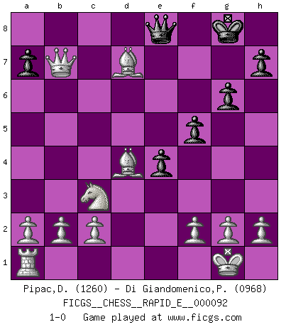 Last move : 1-0 2012 December 29 9:53:31 [Event "FICGS__CHESS__RAPID_E__000092"] [Site "FICGS"] [Date "2012.12.09"] [Round "1"] [White "Pipac,Darko"] [Black "Di Giandomenico,Pierino"] [Result "1-0"] [WhiteElo "1260"] [BlackElo "0968"] 1.e4 e5 2.d4 Bd6 3.dxe5 Bxe5 4.Nf3 Nf6 5.Nxe5 Nxe4 6.Qe2 O-O 7.Qxe4 Qf6 8.Be2 d6 9.Qc4 dxe5 10.O-O Be6 11.Qxc7 Na6 12.Qxb7 Bc8 13.Qxa8 Qe7 14.Qc6 Nb8 15.Qe4 Nc6 16.Qxc6 Bd7 17.Qe4 f6 18.Bc4+ Kh8 19.Nc3 f5 20.Qb7 e4 21.Rd1 Rd8 22.Be3 g6 23.Bb5 Qe8 24.Rxd7 Rxd7 25.Bd4+ Kg8 26.Bxd7 1-0 King's pawn game Kingside Castling by player Black (move 6) Kingside Castling by player White (move 10) Player White won this chess game. Follow this game move after move (download)Openings teach you openings. Endgames teach you chess ! (Stephan Gerzadowicz) Alle Schachspieler sollten auch ein Hobby haben. (Savielly Grigorievitsch Tartakower) El Ajedrez es un cuento de Hadas de las 1001 metidas de pata. (Savielly Tartakower) Si je n'étais pas joueur d'échecs, je serais le meilleur dans quelque chose d'autre. (Anatoli Karpov) I think your argument is specious - I think your tie is ugly. (Gregory House to Dr. Foreman, House M.D.)