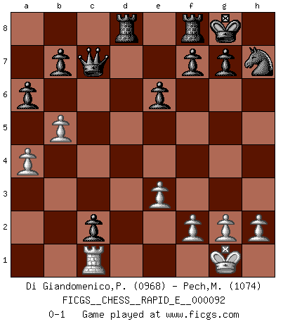 Last move : 0-1 2013 April 2 12:35:6 [Event "FICGS__CHESS__RAPID_E__000092"] [Site "FICGS"] [Date "2012.12.09"] [Round "1"] [White "Di Giandomenico,Pierino"] [Black "Pech,Matej"] [Result "0-1"] [WhiteElo "0968"] [BlackElo "1074"] 1.d4 Nf6 2.e3 c5 3.Nf3 e6 4.dxc5 Bxc5 5.Qd2 d5 6.Bb5+ Bd7 7.Bxd7+ Nbxd7 8.O-O O-O 9.Nc3 Qc7 10.Ng5 a6 11.b3 Bb4 12.Nxh7 Bxc3 13.Qd3 Nxh7 14.Bd2 Bxa1 15.Rxa1 Ne5 16.c4 Nxd3 17.a4 dxc4 18.b4 c3 19.Bc1 Nxc1 20.Rxc1 Rad8 21.b5 c2 0-1 Queen's pawn game Kingside Castling by player White (move 8) Kingside Castling by player Black (move 8) Player Black won this chess game. Follow this game move after move (download)Chess mastery essentially consists of analyzing Chess positions accurately. (Mikhail Botvinnik) Ich erzeugte keinen Neid, da mich die Schachspieler als Musiker und die Musiker als Schachspieler betrachteten. (Mark Taimanov) Aquel que toma al Peón de Caballo de la Reina, se pasará la noche a dormir en la calle. (Anónimo) Avec des compensations pour le matériel en plus... (Anonyme) Never was anything great achieved without danger. (Niccolo Machiavelli)