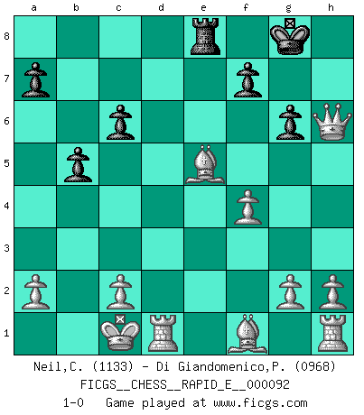 Last move : 1-0 2012 December 29 9:53:49 [Event "FICGS__CHESS__RAPID_E__000092"] [Site "FICGS"] [Date "2012.12.09"] [Round "1"] [White "Neil,Charlie"] [Black "Di Giandomenico,Pierino"] [Result "1-0"] [WhiteElo "1133"] [BlackElo "0968"] 1.e4 e5 2.Nf3 Nf6 3.d4 Bd6 4.dxe5 Bxe5 5.Nxe5 Nxe4 6.Qe2 O-O 7.Be3 Qf6 8.Nf3 Qxb2 9.Bd4 Nc6 10.Bxb2 d6 11.Qxe4 Bg4 12.Qxg4 Ne5 13.Nxe5 dxe5 14.Nd2 Rae8 15.O-O-O c6 16.Ne4 b5 17.Nf6+ Kh8 18.Nxe8 Rxe8 19.f4 h5 20.Qxh5+ Kg8 21.Bxe5 g6 22.Qh6 1-0 Petrov : Modern (Steinitz) attack Kingside Castling by player Black (move 6) Queenside Castling by player White (move 15) Player White won this chess game. Follow this game move after move (download)Fischer prefers to enter Chess history alone. (Miguel Najdorf) Ich möchte Schüler heranbilden, die das Vermögen haben, selbst zu denken und Kritik zu üben. (Emanuel Lasker) Un entendimiento a fondo de las continuaciones típicas del mate, hace de las combinaciones de sacrificio mas complicadas conducirlas a ellas no solo sin dificultad, sino casi de una manera natural. (Siegbert Tarrasch) On est toujours la mazette de quelqu'un d'autre. (Anonyme) Wipe them out. All of them. (Darth Sidious in Star Wars ep.1)