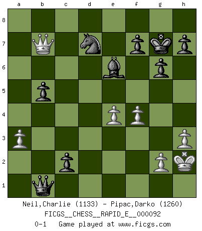 Last move : 0-1 2013 January 5 21:16:49 [Event "FICGS__CHESS__RAPID_E__000092"] [Site "FICGS"] [Date "2012.12.09"] [Round "1"] [White "Neil,Charlie"] [Black "Pipac,Darko"] [Result "0-1"] [WhiteElo "1133"] [BlackElo "1260"] 1.d4 d5 2.c4 c6 3.Nc3 g6 4.f3 Bg7 5.e3 Nf6 6.Bd3 O-O 7.Bd2 Na6 8.Nge2 Nb4 9.Bb1 dxc4 10.O-O Nbd5 11.a3 Qb6 12.Na4 Qc7 13.Nac3 e5 14.dxe5 Qxe5 15.e4 Nxc3 16.Bxc3 Qc5+ 17.Kh1 Qg5 18.Ng3 b5 19.Bd2 Qe5 20.Bc3 Qf4 21.Qe2 Bd7 22.Bc2 Rad8 23.Rad1 Be6 24.Qf2 Qc7 25.Rfe1 Rxd1 26.Rxd1 Rd8 27.Rxd8+ Qxd8 28.Qxa7 Nd7 29.Bxg7 Kxg7 30.Qd4+ Kg8 31.Ne2 Qe7 32.Qa7 Qd6 33.Nc3 Qd2 34.Bb1 Qxb2 35.Qa8+ Kg7 36.h3 Qxc3 37.Qxc6 Qe1+ 38.Kh2 Qxb1 39.Qb7 c3 40.f4 c2 0-1 QGD Slav defense Kingside Castling by player Black (move 6) Kingside Castling by player White (move 10) Player Black won this chess game. Follow this game move after move (download)Capture of the adverse King is the ultimate but not the first object of the game. (William Steinitz) Schach ist Kampf, hauptsächlich jedoch gegen die eigenen Fehler. (Savielly Grigorievitsch Tartakower) Cuando estes solo, cuando te sientas un extraño en el mundo, juega al Ajedrez. Esto levantará tu espiritu y será tu consejero de guerra. (Aristóteles) Les Echecs sont affaire de jugement sensible. Savoir quand frapper et quand esquiver. (Fischer) Question: Is 'This statement is paradoxical' a paradoxical statement ? Or is it a meta-paradox ? (Normajean Yates)